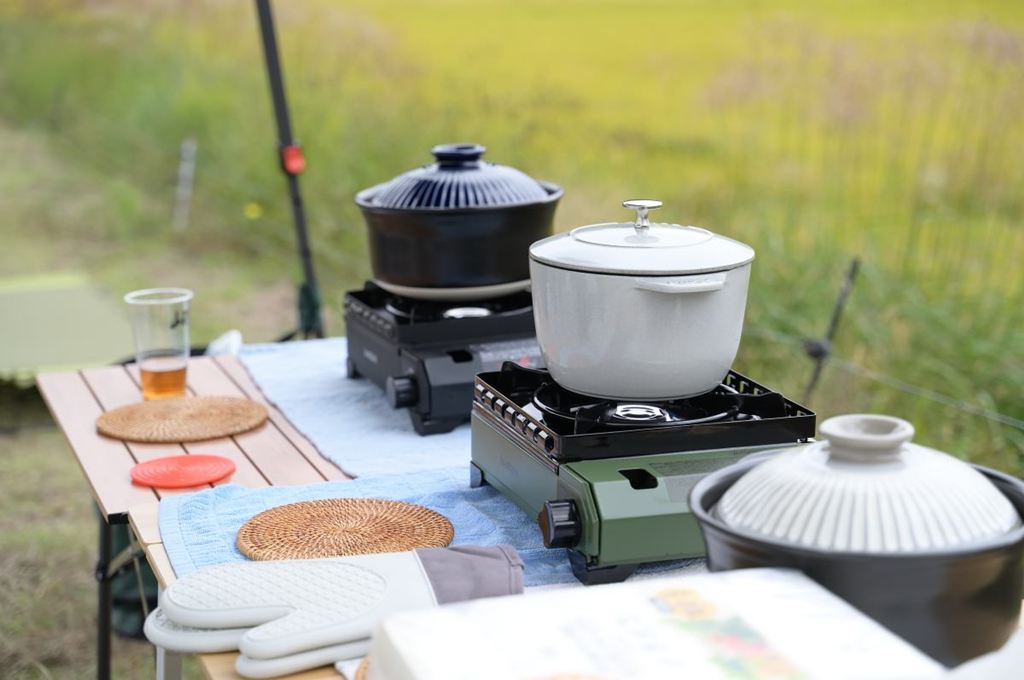 黄金色に色づく稲穂を前に、カセットコンロを設置して絶好のロケーションで行っております。