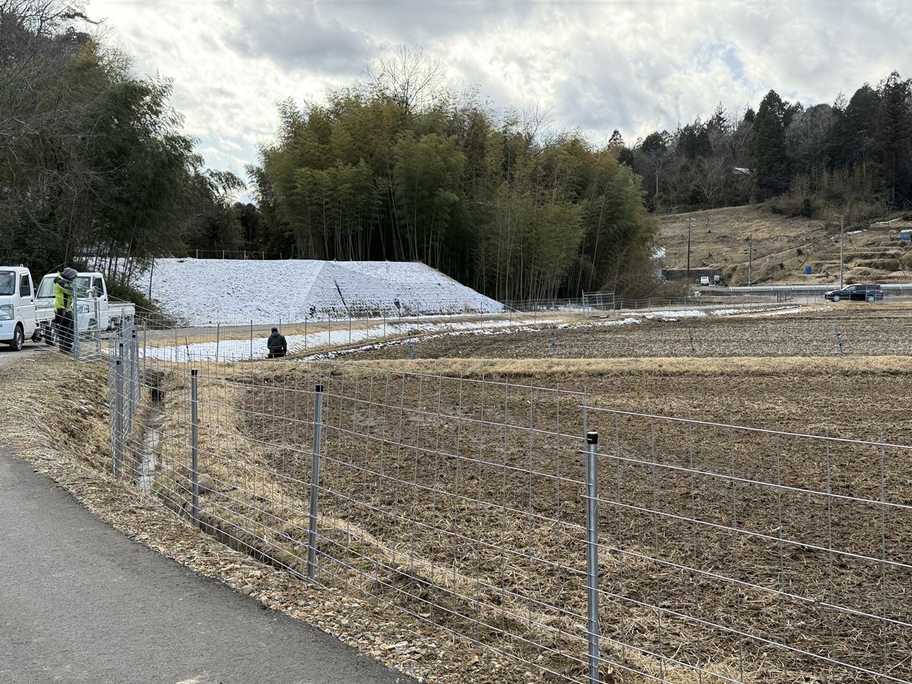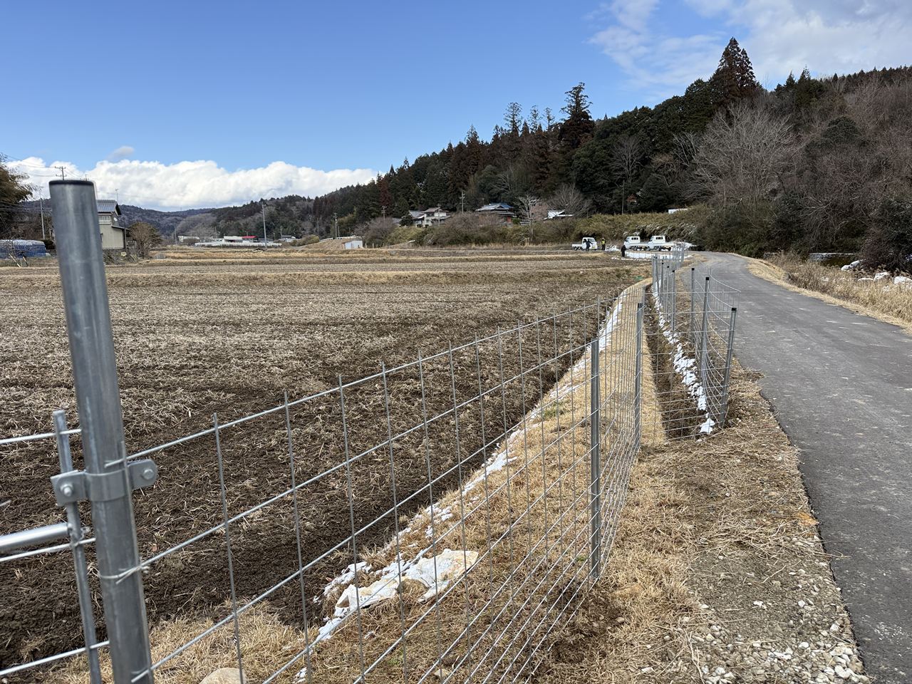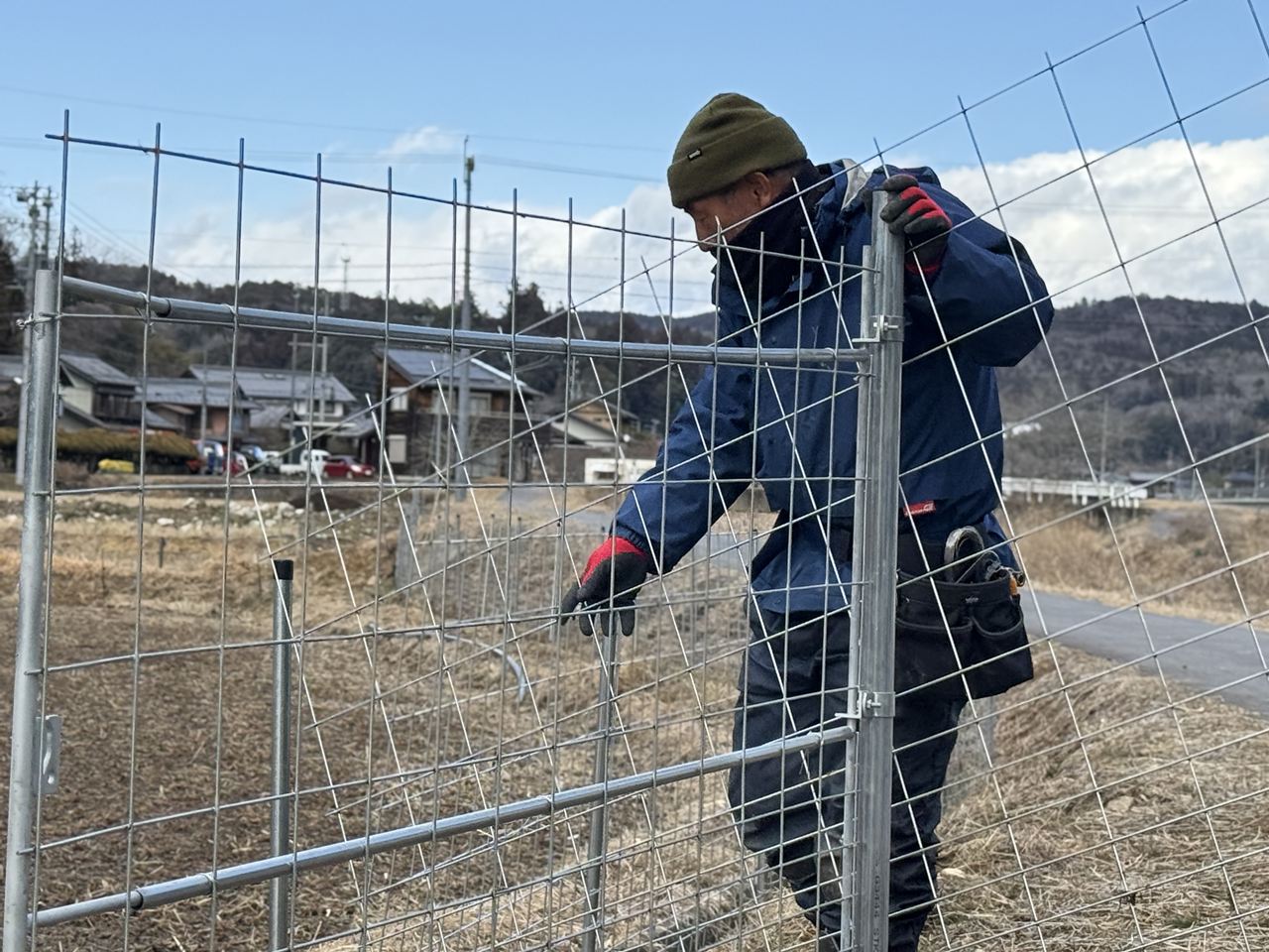 ワイヤーメッシュ(防獣柵)で田んぼを囲み、イノシシやカモシカなどの侵入を防止します。