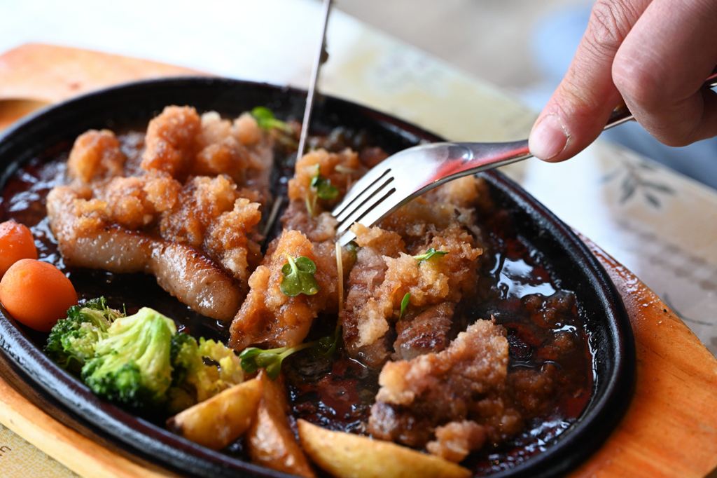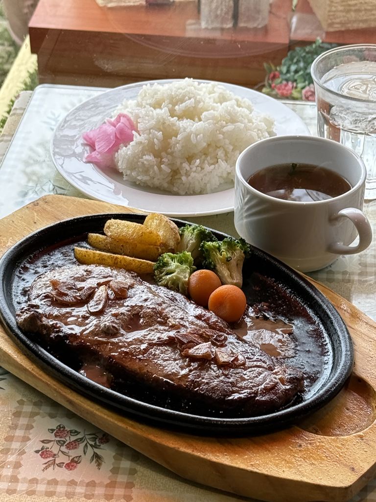 ジュゥ~~っと美味しい音を立てて、サーロインステーキセットが到着しました。